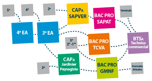4e - 3e EA Découverte professionnelle CAPA SAPVERServices aux personnes et vente en espace rural BAC PRO TCVATechnicien conseil vente en alimentation BAC PRO GMNFGestion des milieux naturels et de la faune BAC PRO SAPATServices aux personnes et aux territoires BTSA Technico-commercialProduits alimentaires et boissons CAPa JPJardinier et paysagiste |